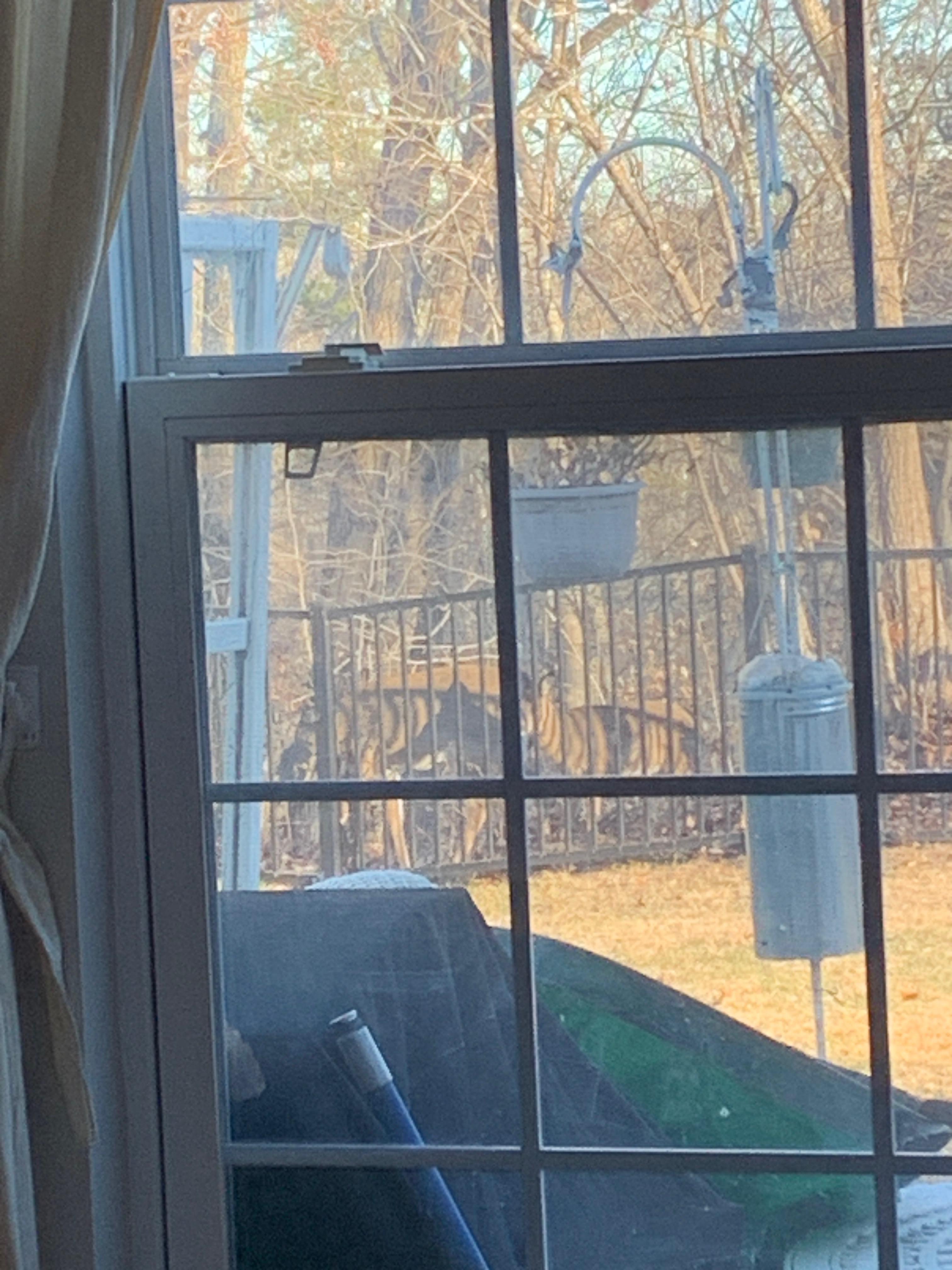 이른 아침 창문에 사슴가족이