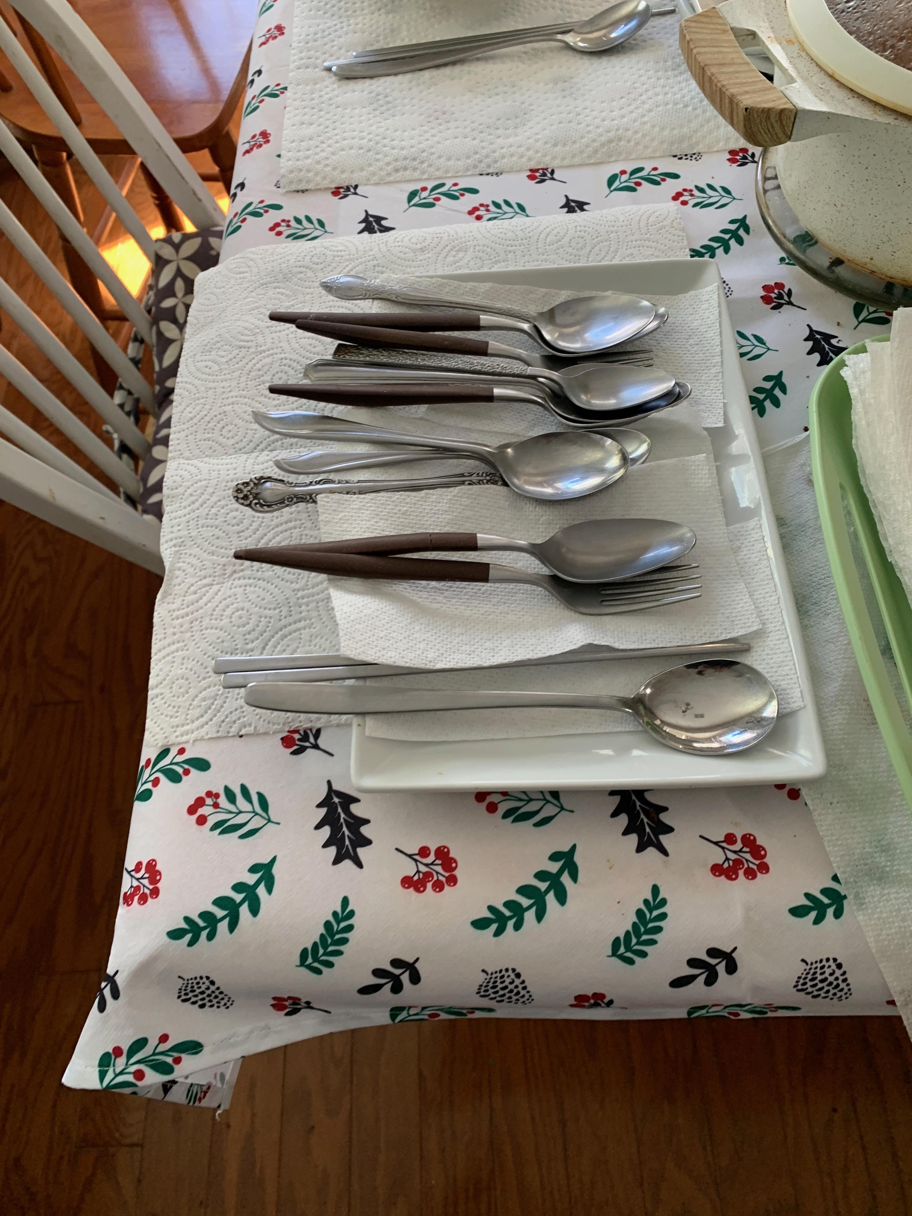 식탁에 큰딸과 손주들 수저와 젓가락 ,포크를