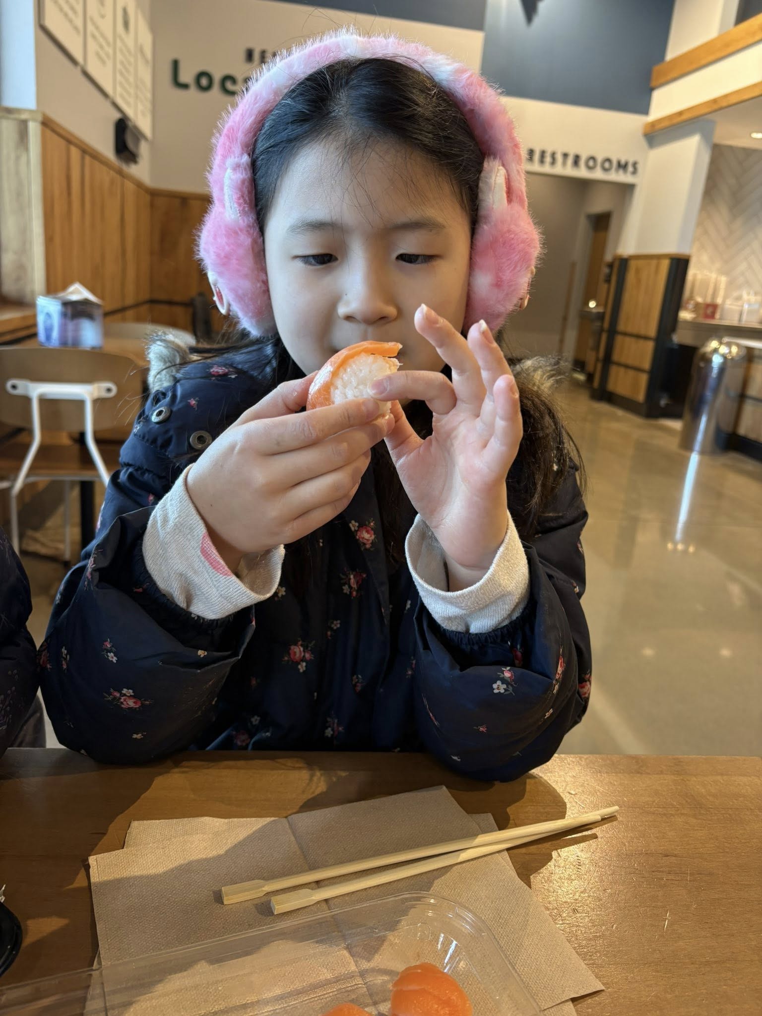 엘라노아가 연어스시를 들여다 보고...